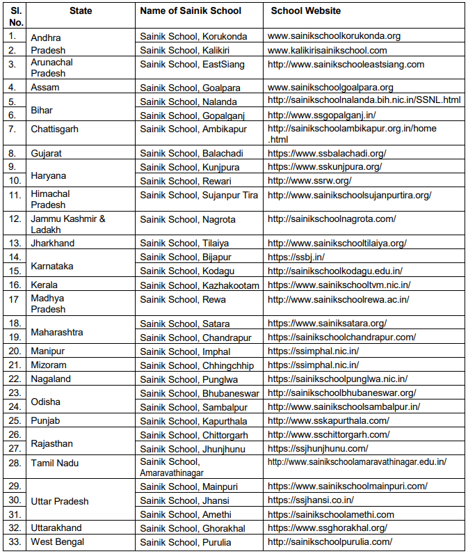 Sainik schools are located pan India. Originally, there were 33 Sainik schools; however, the government aims to open 100 new Sainik schools under public-private-partnership model. Most of these schools are residential; however, some of the new Sainik schools are also day schools. Below is the official list of 33 Sainik schools.